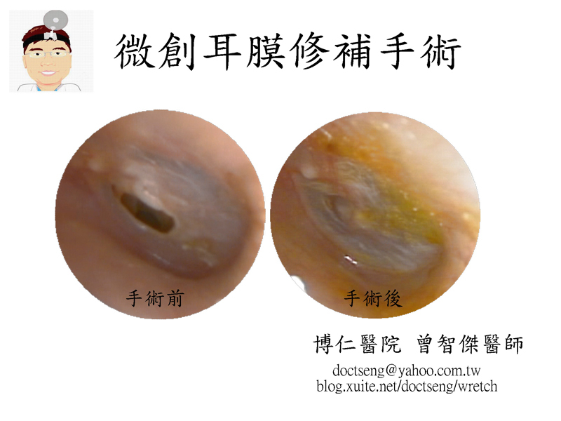 後網路上搜尋得知有曾醫師的微創耳膜修補手術,於是便來就診。曾醫師以人工耳膜加上再生因子治療,不用開刀,沒有傷口。治療後耳膜修補順利,免除了開刀的麻煩。建議耳膜破洞時如及早治療,效果便會更好。